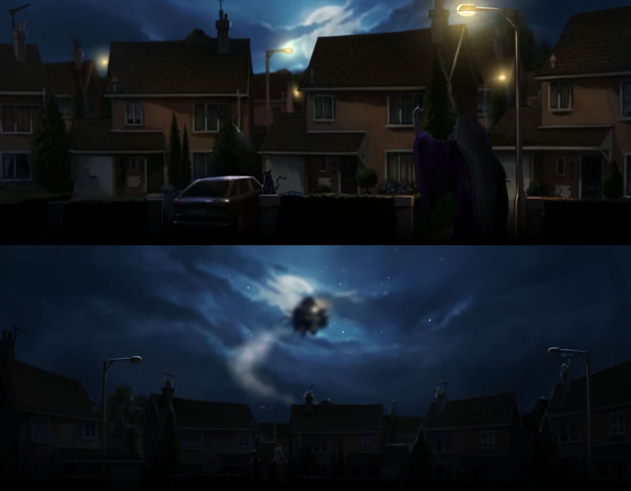 The next moment is the arrival of Dumbledore. You'll get some additional info here about the magical world. And if you moving on the next moment, you'll see Hagrid arriving on the flying motorbike, carrying baby Harry.